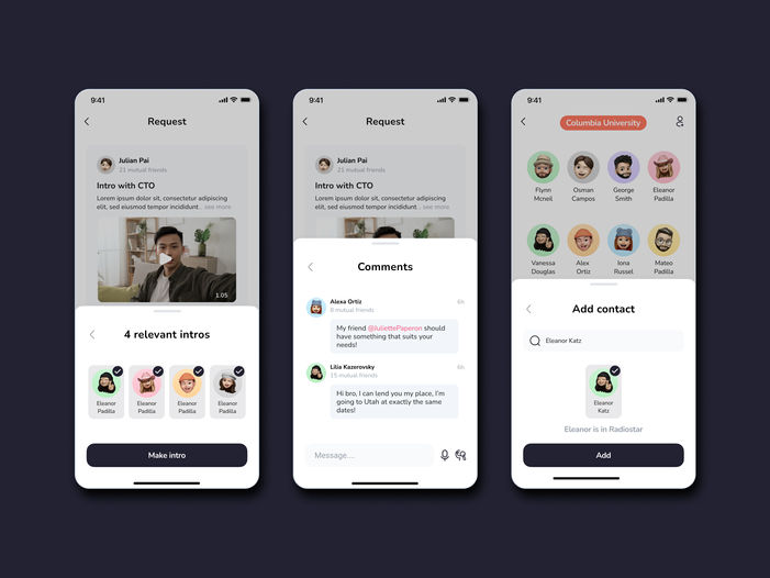 Visionima designed the logo, full UI and UX for the mobile app, prototypes, the presentation materials, and the complete pitch deck. Our work focuses on creating an intuitive experience that supports Radiostar’s goal: a space where trusted connections share opportunities, insights, and advice.